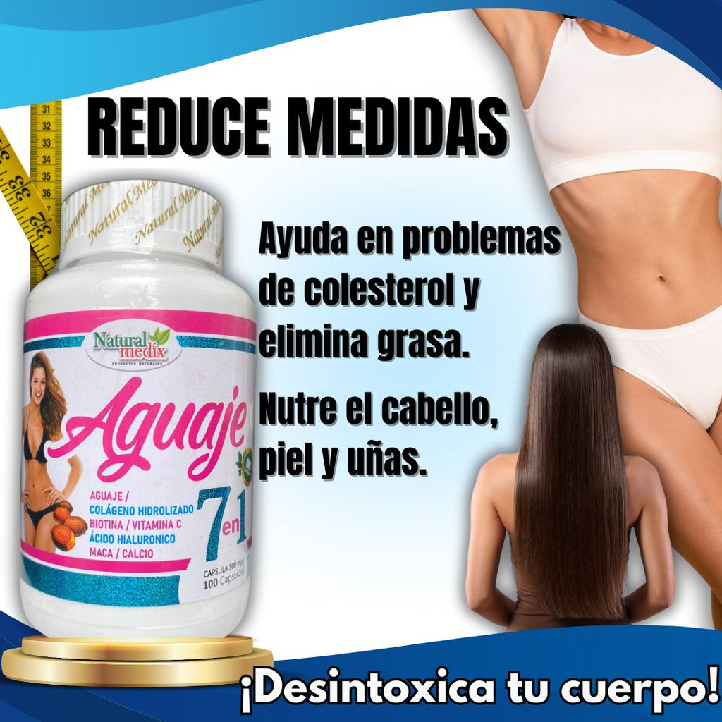Las cápsulas de Aguaje 7 en 1 ofrecen una solución natural para promover el bienestar y ayudar en el control de peso. El aguaje, también conocido como “fruta de la mujer”, es una fruta tropical rica en nutrientes que se ha utilizado tradicionalmente por sus propiedades beneficiosas para la salud.Este suplemento combina el poder del aguaje con otros ingredientes naturales seleccionados por sus efectos en la pérdida de peso y la salud digestiva. Las cápsulas de Aguaje 7 en 1 pueden ayudar a reducir medidas, mejorar la digestión, aumentar la sensación de saciedad y promover la desintoxicación del cuerpo.Además de sus beneficios para el control de peso, el aguaje también es rico en antioxidantes, vitaminas y minerales que contribuyen al bienestar general. Estas cápsulas son una excelente opción para quienes buscan un enfoque natural y holístico para mejorar su salud y mantener un peso saludable.Aprovecha los beneficios del aguaje en cápsulas convenientes y fáciles de tomar. Incorpora las cápsulas de Aguaje 7 en 1 a tu rutina diaria y descubre una forma natural de alcanzar tus objetivos de bienestar y control de peso.Modo de Uso: Se recomienda tomar una cápsula de Aguaje 7 en 1, dos veces al día, preferiblemente con una comida. Para obtener mejores resultados, se puede seguir el uso regularmente como parte de un estilo de vida saludable que incluya una dieta equilibrada y ejercicio físico regular.Características Destacadas:Fórmula Especializada: Aguaje y otros componentes seleccionados se unen para proporcionar un apoyo integral para reducir medidas.Moldea tu Figura: Contribuye al proceso de modelado corporal y bienestar general.Cápsulas Convenientes: Fácil de incorporar a tu rutina diaria, las cápsulas ofrecen una forma práctica de obtener los beneficios.Beneficios de Aguaje Reduce Medidas Plus:Apoyo al Modelado Corporal: Puede contribuir a reducir medidas y moldear la figura.Bienestar Integral: Ingredientes cuidadosamente seleccionados para favorecer el equilibrio y bienestar general.Conveniencia Diaria: Las cápsulas facilitan la incorporación de este suplemento en tu rutina diaria.Las cápsulas de Aguaje 7 en 1 son un suplemento dietario diseñado para promover el bienestar y ayudar en el control de peso. Con una poderosa combinación de aguaje y otros ingredientes naturales, este producto ayuda a reducir medidas, mejorar la salud digestiva y aumentar la vitalidad. Aprovecha los beneficios del aguaje en cápsulas convenientes y fáciles de tomar.Beneficios: Las cápsulas de Aguaje 7 en 1 ofrecen una serie de beneficios para la salud, incluyendo:Reducción de medidas y control de peso.Mejora de la salud digestiva.Aumento de la sensación de saciedad.Desintoxicación del cuerpo.Aporte de antioxidantes, vitaminas y minerales para el bienestar general.CONTENIDO1 frasco de 100 capsulas NOTA: En caso de presentar efectos secundarios, suspender su uso inmediatamente.PRODUCTO CIENTIFICAMENTE COMPROBADO, CUENTA CON CERTIFICADO INVIMA. ESTIMADO DROPSHIPPER - TIEMPO DE DESPACHOSi tu orden se monta antes de las 11:00 AM tu pedido será despachado el mismo día, los días sábados el corte se realizará a las 10:00AM.Trabajamos con: ENVIA, COORDINADORA, INTERRAPIDISIMO Y FUTURA. (SI TU PEDIDO ES MONTADO CON OTRA TRANSPORTADORA DEBES CANCELARLO Y MONTARLO CON ALGUNA DE LAS MENCIONADAS) TIEMPO DE GARANTÍASTodos nuestros productos cuentan con garantía. Sin embargo, es importante tener en cuenta que la garantía estará sujeta a las condiciones de recepción del producto. Además, es vital que el cliente haga un buen uso del producto, ya que cualquier mal uso o daño causado por un uso inadecuado puede anular la garantía. (30 días de garantía) PARA MAYOR INFORMACIÓN PUEDE CONTACTARSE SOLO AL WHATSAPP (NO LLAMADAS) +573204841373 - IMPORTANTE LABORAMOS EN HORARIO DE OFICINA DE LUNES A VIERNES.